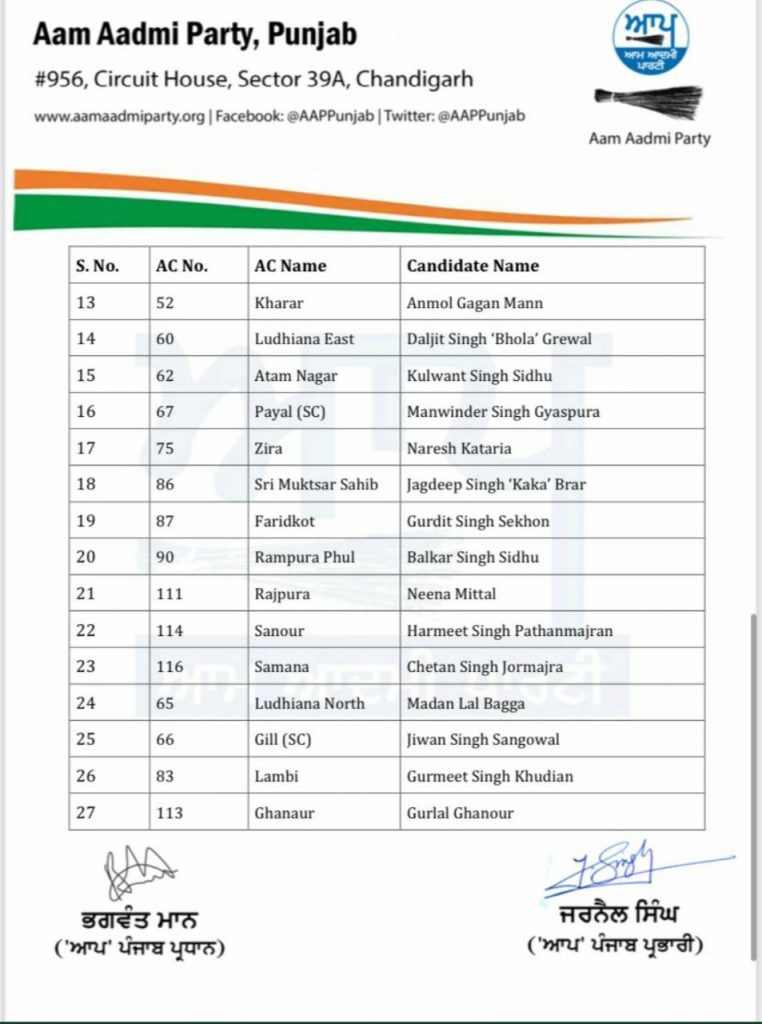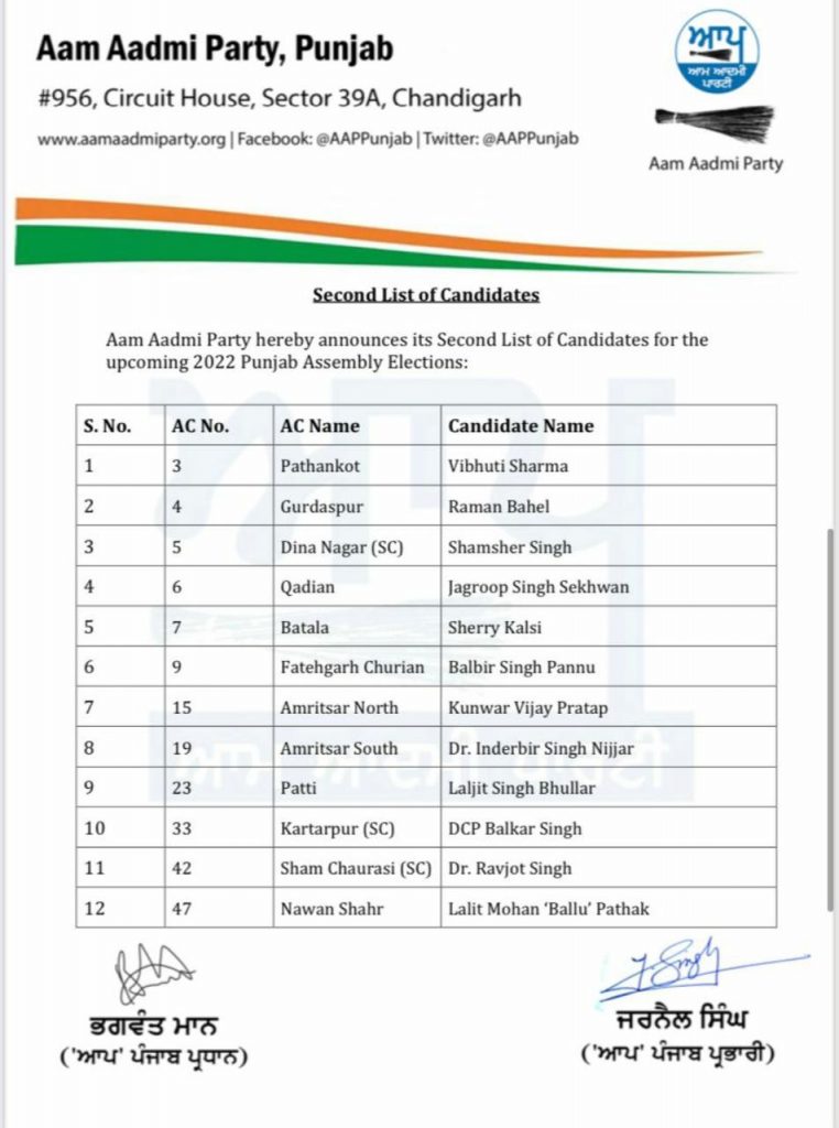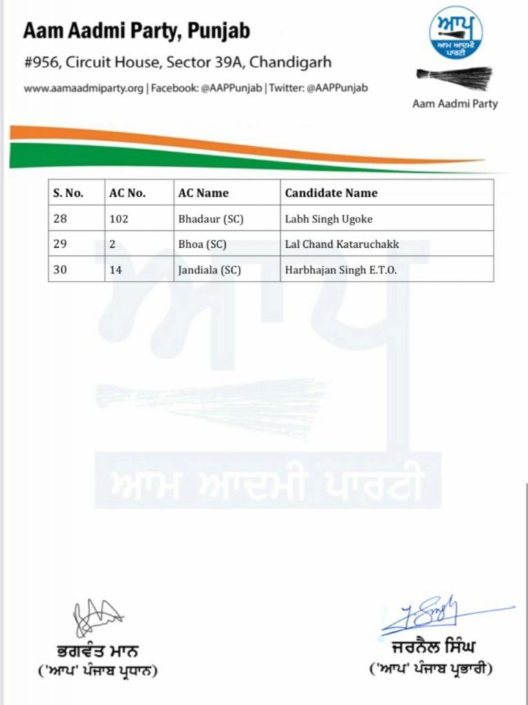 ਚੰਡੀਗੜ੍ਹ 10 ਦਸੰਬਰ (ਪ.ਪ.) : ਪੰਜਾਬ ਵਿਚ ਚੋਣਾਂ ਦਾ ਬਿਗਲ ਵੱਜ ਚੁੱਕਾ ਹੈ ਤੇ ਅਕਾਲੀ ਦਲ ਤੋਂ ਬਾਅਦ ਆਮ ਆਦਮੀ ਪਾਰਟੀ ਨੇ ਉਮੀਦਵਾਰਾਂ ਦਾ ਐਲਾਨ ਕਰਨ ਵਿਚ ਬਾਜ਼ੀ ਮਾਰੀ ਹੈ । ਅੱਜ ਆਮ ਆਦਮੀ ਪਾਰਟੀ ਨੇ 30 ਹੋਰ ਉਮੀਦਵਾਰਾਂ ਦੀ ਲਿਸ਼ਟ ਜਾਰੀ ਕਰ ਦਿਤੀ ਹੈ।