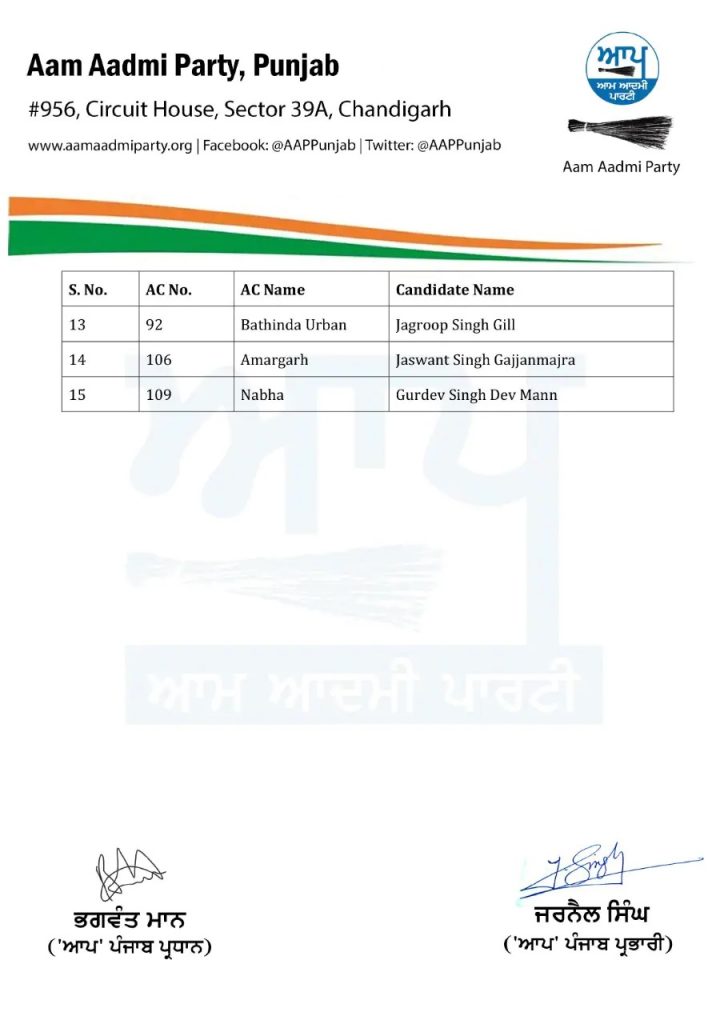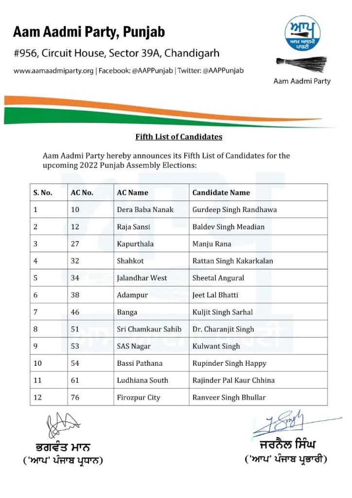 ਪੰਜਾਬ ਵਿੱਚ ਜਿਵੇਂ ਜਿਵੇਂ ਵਿਧਾਨ ਸਭਾ ਚੋਣਾਂ ਆ ਰਹੀਆਂ ਹਨ । ਊਵੇਂ ਊਵੇਂ ਹੀ ਪਾਰਟੀਆਂ ਵਿੱਚ ਸਰਗਰਮੀਆਂ ਵੱਧਦੀਆਂ ਜਾ ਰਹੀਆਂ ਹਨ । ਅੱਜ ਆਮ ਆਦਮੀ ਪਾਰਟੀ ਨੇ ਵਿਧਾਨ ਸਭਾ ਚੋਣ ਲੜਨ ਵਾਲੇ ਆਪਣੇ ਉਮੀਦਵਾਰਾਂ ਦੀ ਪੰਜਵੀਂ ਲਿਸਟ ਜਾਰੀ ਕਰ ਦਿੱਤੀ ਹੈ । ਇਹ ਲਿਸਟ ਤੁਸੀਂ ਥੱਲੇ ਦੇਖ ਸਕਦੇ ਹੋ