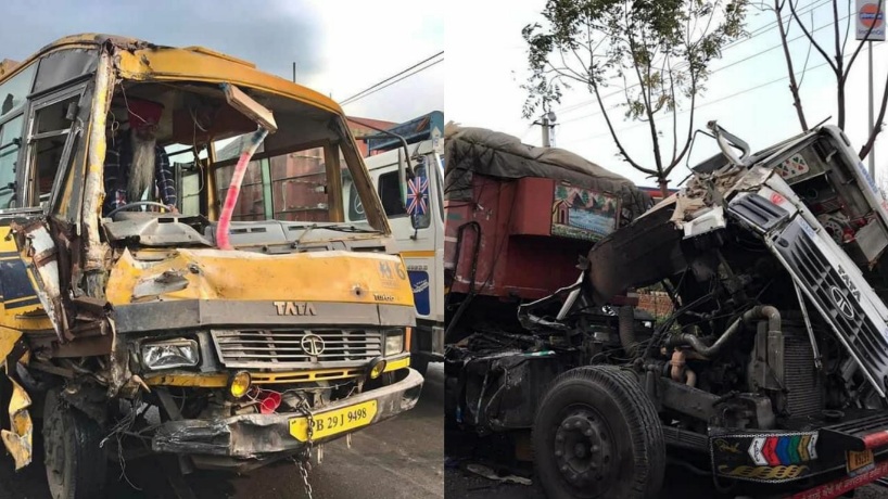 ਮੋਗਾ 26 ਫਰਵਰੀ (ਸੋਰਵ ਅਰੋੜਾ) : ਮੋਗਾ ਸ਼ਹਿਰ ਦੇ ਕੋਟਕਪੂਰਾ ਬਾਈਪਾਸ ‘ਤੇ ਸ਼ਨੀਵਾਰ ਸਵੇਰੇ ਸਕੂਲੀ ਬੱਚਿਆਂ ਨਾਲ ਭਰੀ ਬੱਸ ਦੀ ਟਰਾਲੇ ਨਾਲ ਟੱਕਰ ਹੋ ਗਈ। ਜਿਸ ਤੋਂ ਬਾਅਦ ਮੌਕੇ ‘ਤੇ ਹਫੜਾ-ਦਫੜੀ ਮਚ ਗਈ। ਹਾਲਾਂਕਿ ਇਸ ਹਾਦਸੇ ਵਿੱਚ ਕਿਸੇ ਵੀ ਤਰ੍ਹਾਂ ਦਾ ਜਾਨੀ ਨੁਕਸਾਨ ਹੋਣ ਤੋਂ ਬਚਾਅ ਹੋ ਗਿਆ ਹੈ। ਪਰ ਕਈ ਬੱਚੇ ਜ਼ਖਮੀ ਹੋਏ ਹਨ ਤੇ ਇੱਕ ਅਧਿਆਪਕ ਦੀ ਲੱਤ ਵੀ ਟੁੱਟ ਗਈ ਹੈ ਅਤੇ ਬੱਸ ਡਰਾਈਵਰ ਗੰਭੀਰ ਜ਼ਖ਼ਮੀ ਦੱਸਿਆ ਜਾ ਰਿਹਾ ਹੈ। ਮੌਕੇ ਤੇ ਥਾਣਾ ਮੁਖੀ ਲਛਮਣ ਸਿੰਘ ਪੁਲਿਸ ਪਾਰਟੀ ਸਮੇਤ ਪਹੁੰਚੇ ਅਤੇ ਪੀੜਤਾਂ ਦੇ ਬਿਆਨ ਲਿਖ ਕੇ ਅਗਲੀ ਕਾਰਵਾਈ ਅਮਲ ਵਿਚ ਲਿਆਂਦੀ ਗਈ।
