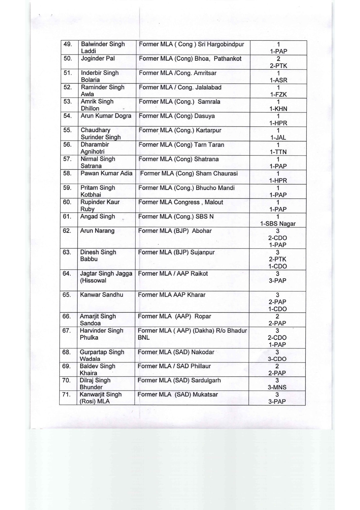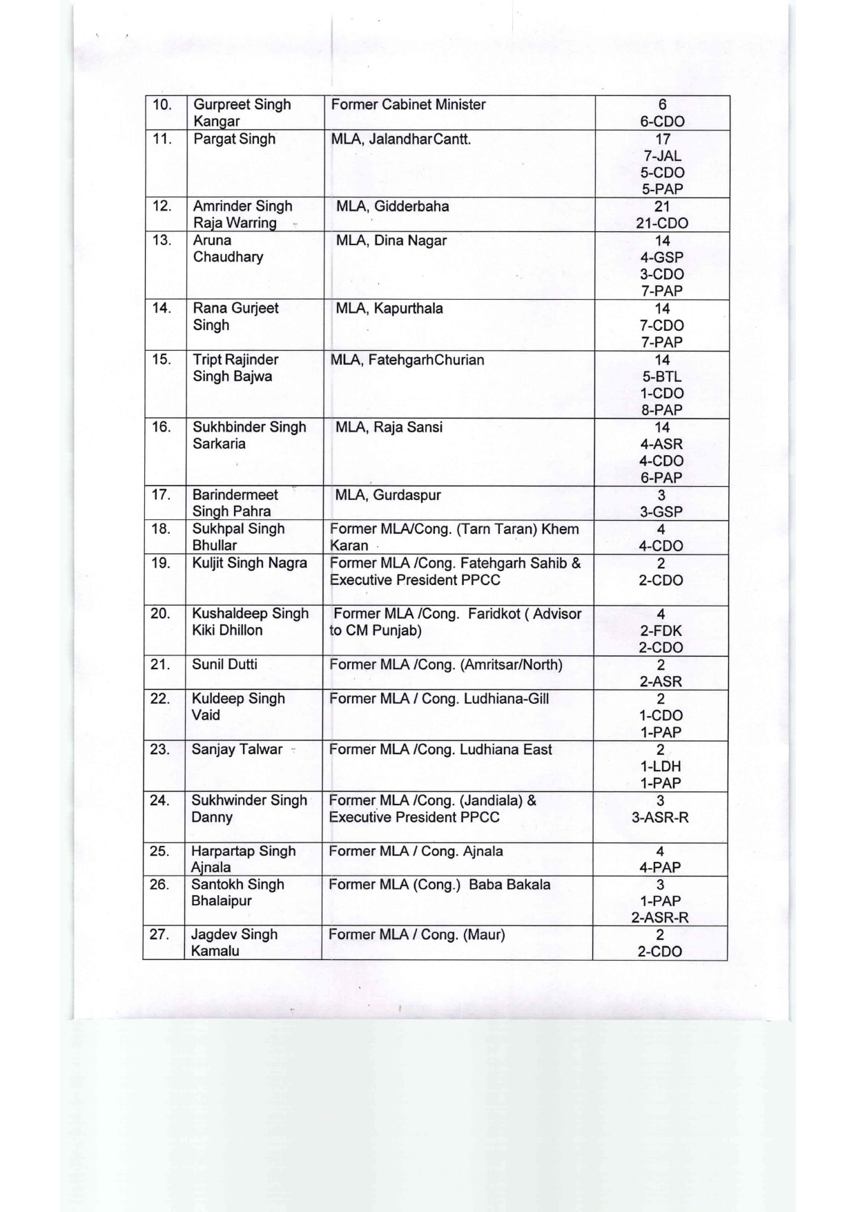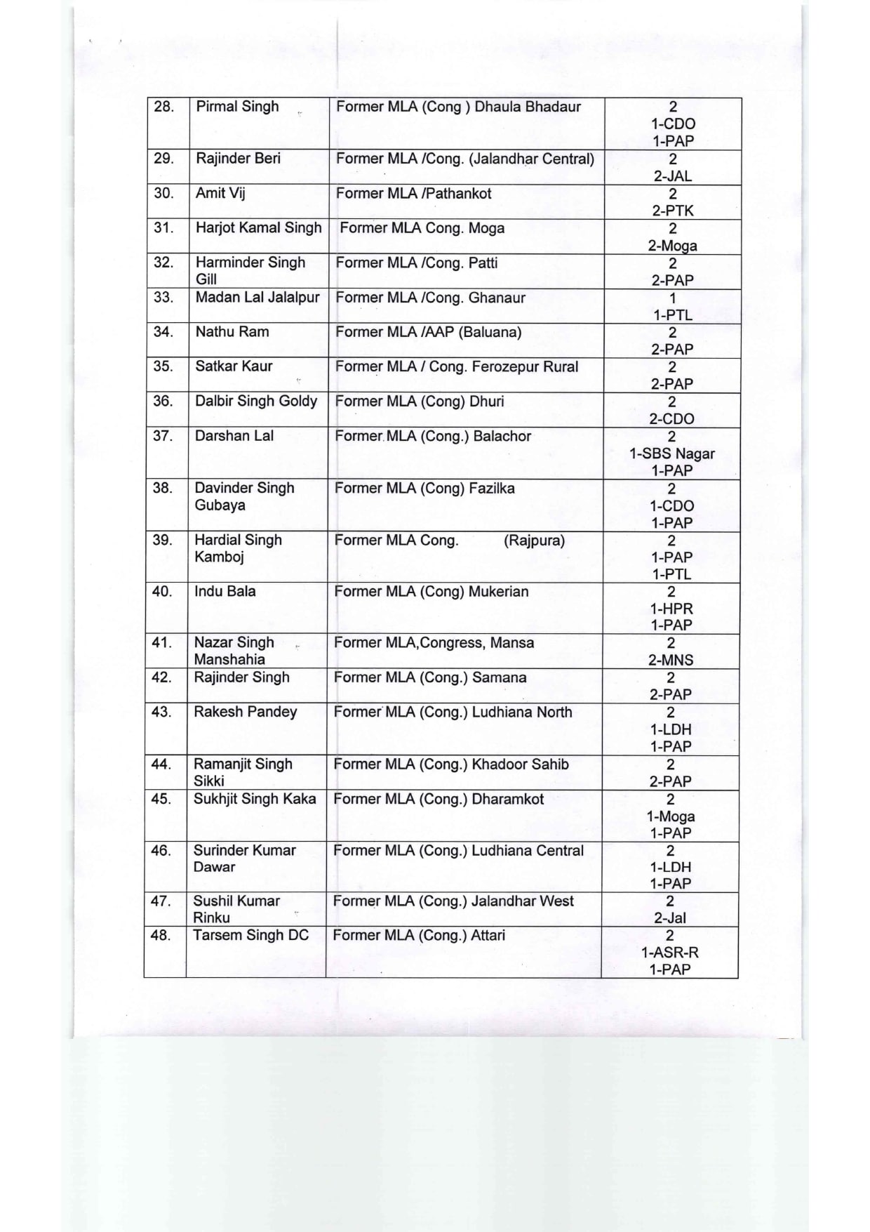 ਇਸ ਤੋਂ ਇਲਾਵਾ ਸਾਬਕਾ ਕੈਬਨਿਟ ਮੰਤਰੀ ਗੁਰਪ੍ਰੀਤ ਸਿੰਘ ਕਾਂਗੜ, ਪਰਗਟ ਸਿੰਘ, ਅਰੂਣਾ ਚੌਧਰੀ, ਰਾਣਾ ਗੁਰਜੀਤ ਸਿੰਘ, ਤ੍ਰਿਪਤ ਰਜਿੰਦਰ ਬਾਜਵਾ, ਸੁੱਖ ਸਰਕਾਰੀਆ, ਕੁਲਜੀਤ ਨਾਗਰਾ, ਸੁਨੀਲ ਦੱਤੀ, ਕੁਲਦੀਪ ਵੈਦ, ਸੰਜੇ ਤਲਵਾਰ, ਸੁੱਖਵਿੰਦਰ ਸਿੰਘ ਡੈਨੀ ਅਤੇ ਰਾਜਿੰਦਰ ਬੇਰੀ ਦੀ ਸੁਰੱਖਿਆ ਵੀ ਵਾਪਸ ਲਈ ਜਾਵੇਗੀ।