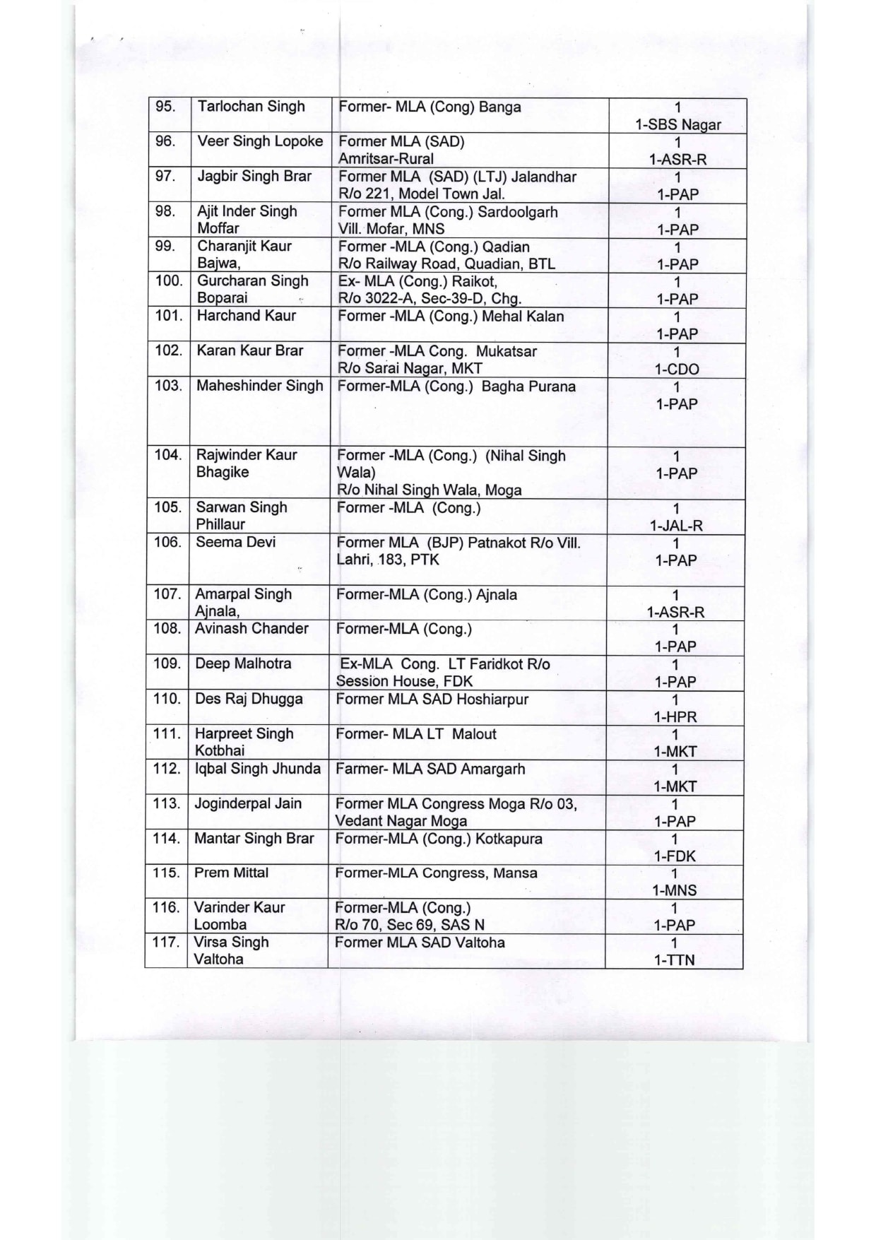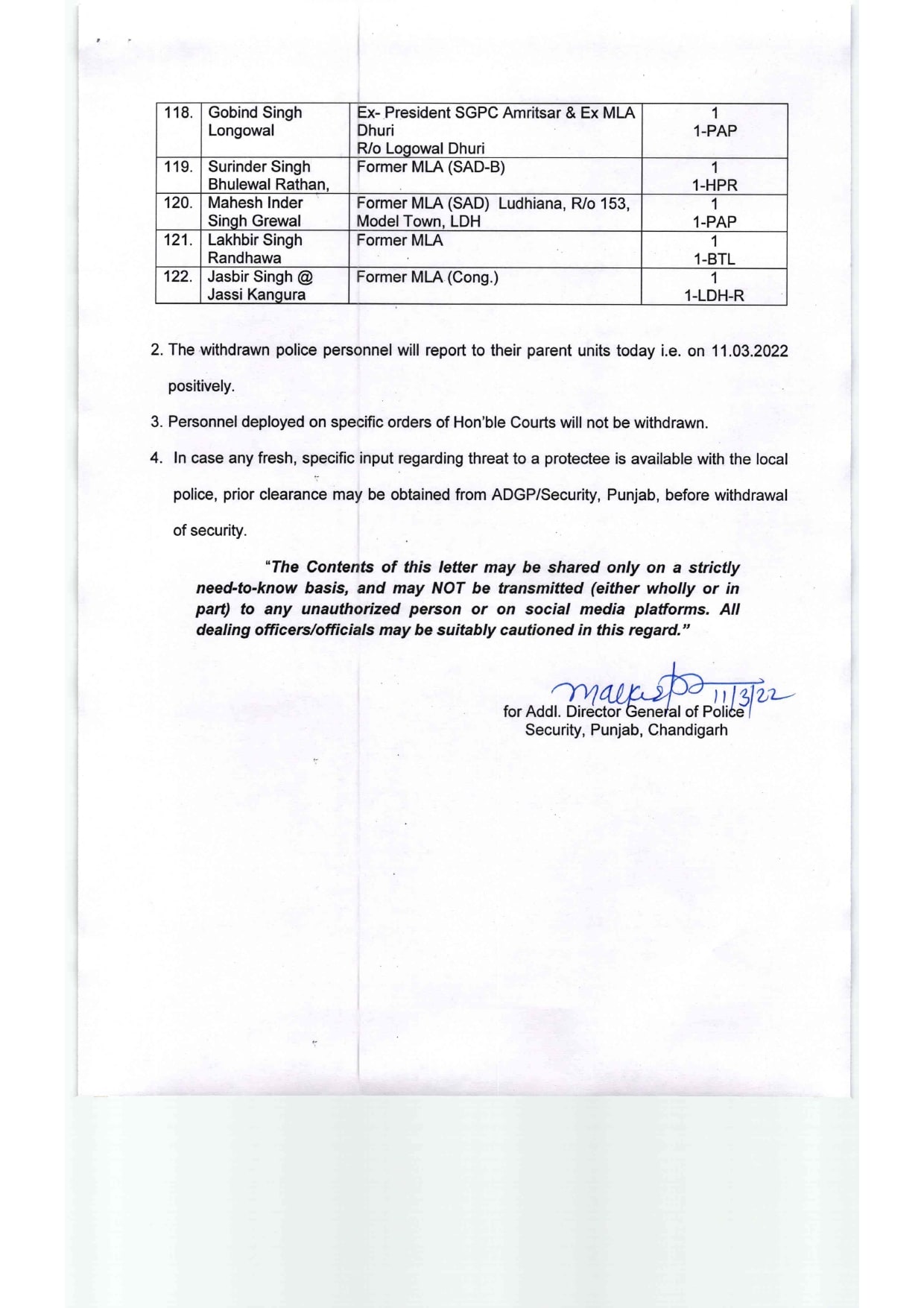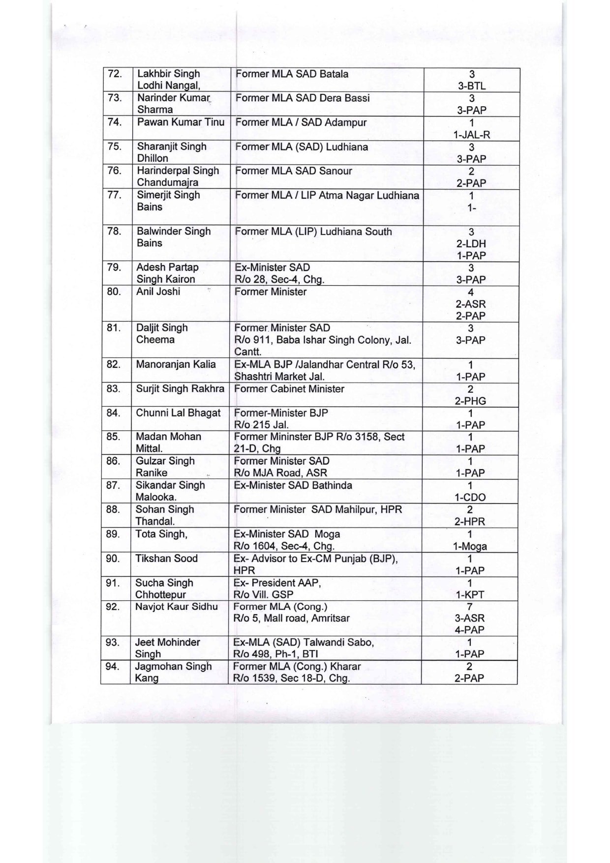 ਇਸ ਤੋਂ ਇਲਾਵਾ ਸਾਬਕਾ ਕੈਬਨਿਟ ਮੰਤਰੀ ਗੁਰਪ੍ਰੀਤ ਸਿੰਘ ਕਾਂਗੜ, ਪਰਗਟ ਸਿੰਘ, ਅਰੂਣਾ ਚੌਧਰੀ, ਰਾਣਾ ਗੁਰਜੀਤ ਸਿੰਘ, ਤ੍ਰਿਪਤ ਰਜਿੰਦਰ ਬਾਜਵਾ, ਸੁੱਖ ਸਰਕਾਰੀਆ, ਕੁਲਜੀਤ ਨਾਗਰਾ, ਸੁਨੀਲ ਦੱਤੀ, ਕੁਲਦੀਪ ਵੈਦ, ਸੰਜੇ ਤਲਵਾਰ, ਸੁੱਖਵਿੰਦਰ ਸਿੰਘ ਡੈਨੀ ਅਤੇ ਰਾਜਿੰਦਰ ਬੇਰੀ ਦੀ ਸੁਰੱਖਿਆ ਵੀ ਵਾਪਸ ਲਈ ਜਾਵੇਗੀ।