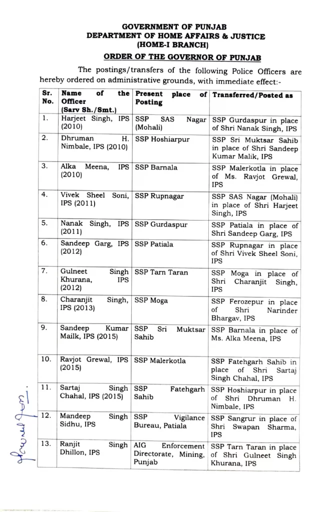 ਚੰਡੀਗੜ੍ਹ: ਪੰਜਾਬ ਸਰਕਾਰ ਨੇ ਅੱਜ ਪੁਲਿਸ ਵੱਡਾ ਫੇਰਬਦਲ ਕੀਤਾ ਹੈ। ਸੂਬੇ ਦੇ 13 ਜ਼ਿਲ੍ਹਿਆਂ ਦੇ ਐੱਸ.ਐੱਸ.ਪੀ. ਤਬਾਦਲੇ ਕੀਤੇ ਗਏ ਹਨ। ਜਿਥੇ ਸਭ ਤੋਂ ਵੱਡੀ ਗੱਲ ਮੋਗਾ ਦੇ ਨਵੇਂ SSP ਗੁਲਨੀਤ ਸਿੰਘ ਪਹਿਲਾਂ ਵੀ ਬਹੁਤ ਚੰਗੀਆਂ ਸੇਵਾਵਾਂ ਨਿਭਾ ਚੁੱਕੇ ਹਨ.