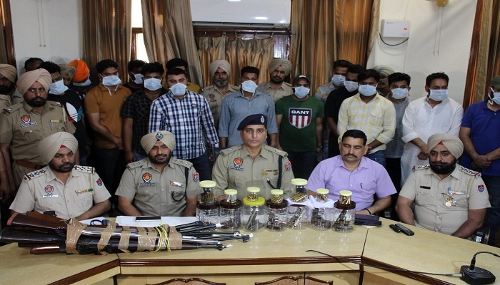ਇਨ੍ਹਾਂ ‘ਚ 4 ਗੈਂਗਸਟਰ ਵੀ ਸ਼ਾਮਿਲ ਹਨ। ਐੱਸ.ਪੀ. (ਡੀ) ਮਨੋਜ ਠਾਕੁਰ ਨੇ ਪੁਲਿਸ ਲਾਈਨ ਵਿਖੇ ਪ੍ਰੈੱਸ ਕਾਨਫ਼ਰੰਸ ਦੱਸਿਆ ਕਿ ਪੁਲਿਸ ਨੇ ਇਨ੍ਹਾਂ ਤੋਂ 7 ਰਾਈਫਲ ਤੇ 7 ਪਿਸਤੌਲ ਬਰਾਮਦ ਕੀਤੇ ਹਨ ਅਤੇ ਤਿੰਨ ਗੱਡੀਆਂ ਵੀ ਜ਼ਬਤ ਕਰ ਲਈਆਂ ਹਨ। ਨਿਗਰਾਨੀ ਇੰਸਪੈਕਟਰ ਬਲਕਾਰ ਸਿੰਘ ਮੁੱਖ ਅਫਸਰ ਥਾਣਾ ਬਿਆਸ ਨੂੰ ਗੁਪਤ ਸੂਚਨਾ ਮਿਲੀ ਕਿ ਕਲਾਨੌਰੀ ਢਾਬਾ ਜੀ.ਟੀ ਰੋਡ ਬਿਆਸ ਵਿਖੇ ਬਹੁਤ ਸਾਰੇ ਵਿਅਕਤੀ ਹਥਿਆਰਾ ਨਾਲ ਲੈਸ ਬੈਠੇ ਹੋਏ ਹਨ। ਜੋ ਇਹ ਵਿਅਕਤੀ ਕਲੋਨੀਆ ਤੇ ਨਜਾਇਜ ਦਵਾਉਂਦੇ ਹਨ। ਜਿਸ ਤੇ ਤੁਰੰਤ ਕਾਰਵਾਈ ਕਰਦਿਆਂ ਮੁੱਖ ਅਫਸਰ ਥਾਣਾ ਬਿਆਸ ਜੀ ਵੱਲੋਂ ਆਪਣੀ ਇੱਕ ਰੇਡ ਪਾਰਟੀ ਨੂੰ ਚੰਗੀ ਤਰ੍ਹਾਂ ਬ੍ਰੀਫ ਕਰਕੇ ਸੁਖਬਰ ਦੀ ਦਸੀ ਹੋਈ ਜਗ੍ਹਾ ਤੇ ਰੇਡ ਕੀਤਾ ਅਤੇ ਮੌਕਾ ਤੋਂ ਹਨ ਲਿਖੇ ਵਿਅਕਤੀਆਂ ਨੂੰ ਨਜਾਇਜ ਹਥਿਆਰਾਂ ਸਮੇਤ ਕਾਬੂ ਕੀਤਾ ਹੈ। ਫੜੇ ਗਏ ਵਿਅਕਤੀਆਂ ਦੀ ਪਛਾਣ ਬਲਵਿੰਦਰ ਸਿੰਘ ਉਰਫ ਡੋਨੀ ਪੁੱਤਰ ਹਰਬੰਸ ਸਿੰਘ ਵਾਸੀ ਪੱਤੀ ਬਲੌਰ ਕੀ ਸਠਿਆਲਾ, ਪ੍ਰਭਜੋਤ ਸਿੰਘ ਪੁੱਤਰ ਅਮਰੀਕ ਸਿੰਘ ਵਾਸੀ ਸ਼ੇਰੋ ਬਾਘਾ, ਜਰਮਨਜੀਤ ਸਿੰਘ ਪੁੱਤਰ ਹਰਭਜਨ ਸਿੰਘ ਵਾਸੀ ਜਵੰਦਪੁਰ ਥਾਣਾ ਵੈਰੋਵਾਲ ਜਿਲ੍ਹਾ ਤਰਨ ਤਾਰਨ, ਗੁਰਦੀ ਸਿੰਘ ਪੁੱਤਰ ਸਰਭਜੀਤ ਸਿੰਘ ਵਾਸੀ ਪੱਤੀ ਗੋਪੀ ਕੀ ਸਠਿਆਲਾ, ਗੁਰਪ੍ਰੀਤ ਸਿੰਘ ਪੁੱਤਰ ਸੋਹਣ ਸਿੰਘ ਵਾਸੀ ਬੱਲ ਸਰਾਂ, ਨਵਦੀਪ ਸਿੰਘ ਉਰਫ ਨਵ ਪੱਡਾ ਪੁੱਤਰ ਇਕਬਾਲ ਸਿੰਘ ਵਾਸੀ ਕੋਟ ਮਹਿਤਾਬ ਥਾਣਾ ਬਿਆਸ, ਰੁਪਿੰਦਰ ਸਿੰਘ ਪੁੱਤਰ ਗੁਰਮੇਲ ਸਿੰਘ ਵਾਸੀ ਫਾਜਲਪੁਰ ਥਾਣਾ ਵੈਰੋਵਾਲ, ਮਨਜਿੰਦਰ ਸਿੰਘ ਪੁੱਤਰ ਹਰਜੀਤ ਸਿੰਘ ਵਾਸੀ ਧਰਦਿਓ ਥਾਣਾ ਮਹਿਤਾ, ਰਣਜੀਤ ਸਿੰਘ ਪੁੱਤਰ ਬਲਕਾਰ ਸਿੰਘ ਵਾਸੀ ਸਠਿਆਲਾ, ਗਗਨਦੀਪ ਸਿੰਘ ਪੁੱਤਰ ਕੁਲਵੰਤ ਸਿੰਘ ਵਾਸੀ ਟਾਂਗਰਾ, ਮਨਪ੍ਰੀਤ ਸਿੰਘ ਪੁੱਤਰ ਰਣਜੀਤ ਸਿੰਘ ਵਾਸੀ ਚੰਬਲ ਥਾਣਾ ਸਰਹਾਲੀ ਤਰਨ ਤਾਰਨ, ਗੁਰਪ੍ਰੀਤ ਸਿੰਘ ਪੁੱਤਰ ਸਮਰਾਜ ਸਿੰਘ ਵਾਸੀ ਸਠਿਆਲਾ, ਰਵਿੰਦਰ ਸਿੰਘ ਪੁੱਤਰ ਜਸਵੰਤ ਸਿੰਘ ਵਾਸੀ ਵੇਰਕਾ ਅੰਮ੍ਰਿਤਸਰ, ਗੁਰਪ੍ਰੀਤ ਸਿੰਘ ਪੁੱਤਰ ਮੇਜਰ ਸਿੰਘ ਵਾਸੀ ਮਾਨਾਵਾਲਾ ਕਲਾਂ, ਬੇਅੰਤ ਸਿੰਘ ਪੁੱਤਰ ਜਗਤਾਰ ਸਿੰਘ ਵਾਸੀ ਕੋਟਲਾ ਬੱਥੂਨਗਰ, ਵਿਜੇ ਪੁੱਤਰ ਨਰਿੰਦਰ ਸਿੰਘ ਵਾਸੀ ਅਬੋਹਰ ਵਜੋ ਹੋਈ ਹੈ। ਐੱਸ.ਪੀ. (ਡੀ) ਮਨੋਜ ਠਾਕੁਰ ਨੇ ਦੱਸਿਆ ਕਿ ਉਕਤਾਨ ਕੋਲੋਂ 06 ਪਿਸਟਲ 32 ਬੋਰ 08 ਮੈਜਗਜ਼ੀਨ 40 ਜਿੰਦਾ ਰੌਂਦ, 04 ਰਾਈਫਲ 315 ਬੋਰ 04 ਮੈਗਜ਼ੀਨ 30 ਜਿੰਦਾ ਰੌਂਦ, 02 ਰਾਈਫਲ 12 ਬੋਰ 05 ਜਿੰਦਾ ਰੌਂਦ, 01 ਪਿਸਟਲ 30 ਬੋਰ 02 ਮੈਗਜ਼ੀਨ 16 ਜਿੰਦਾ ਰੌਂਦ, 01 ਸਪਰਿੰਗ ਫੀਲਡ ਰਾਈਫਲ ਸਮੇਤ 30 ਰੌਂਦ ਬਰਾਮਦ ਹੋਏ ਹਨ।