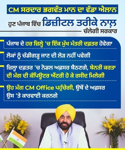 ਮੁੱਖ ਮੰਤਰੀ ਦੇ ਐਲਾਨ ਅਨੁਸਾਰ ਸੂਬੇ ਵਿੱਚ ਡਿਜ਼ੀਟਲ ਸਰਕਾਰ ਤਹਿਤ ਕੰਮ ਹੋਵੇਗਾ। ਹਰ ਜ਼ਿਲ੍ਹੇ ਵਿੱਚ ਇਕ ਮੁੱਖ ਮੰਤਰੀ ਦਫ਼ਤਰ ਹੋਵੇਗਾ, ਜਿਸ ਨਾਲ ਕਿਸੇ ਵੀ ਵਿਅਕਤੀ ਨੂੰ ਹੁਣ ਆਪਣੀ ਸਮੱਸਿਆ ਚੰਡੀਗੜ੍ਹ ਵਿਖੇ ਲੈ ਕੇ ਨਹੀਂ ਜਾਣੀ ਪਵੇਗੀ।
