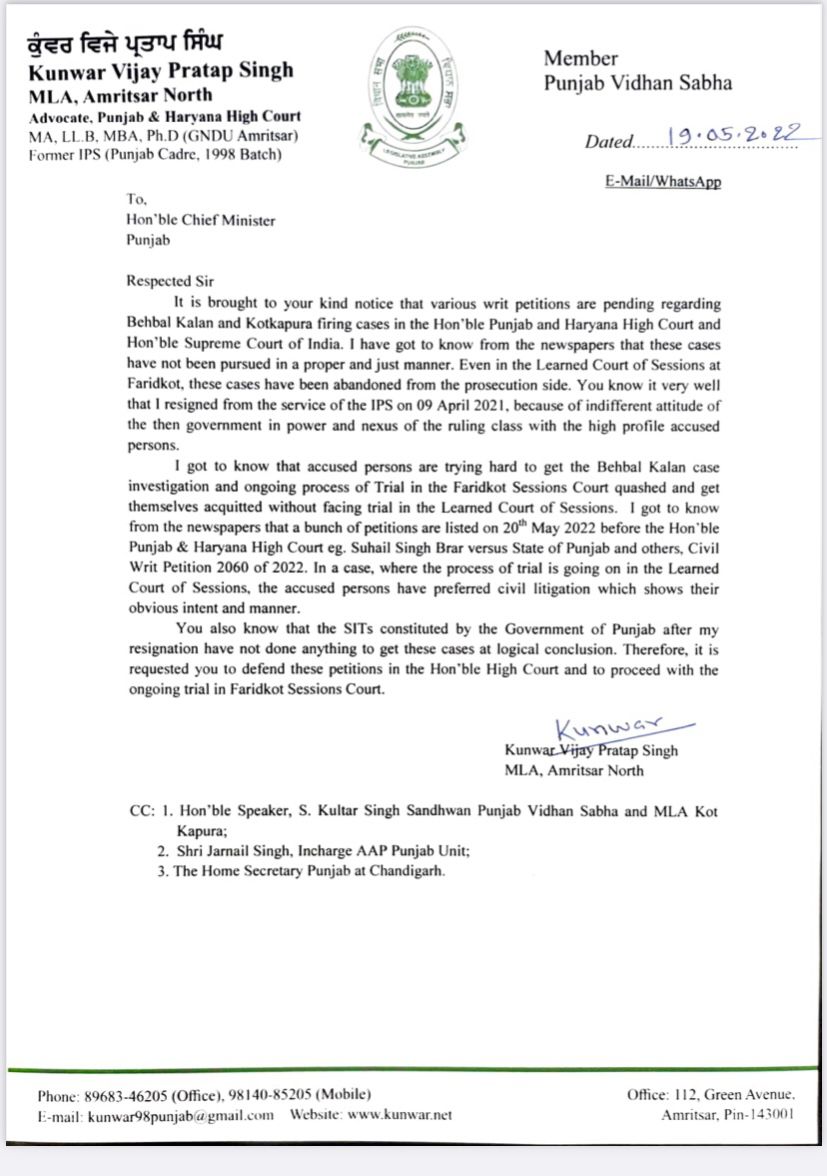 ਪੰਜਾਬ ਵਿੱਚ ਬੇਅਦਬੀਆਂ ਮਾਮਲਿਆਂ ਨੂੰ ਚਲਦਿਆਂ ਲੰਬਾ ਸਮਾਂ ਨਿਕਲ ਚੁੱਕਾ ਹੈ ਪਰ ਕਿਸੇ ਵੀ ਸਰਕਾਰ ਨੇ ਨਾ ਤਾਂ ਬੇਅਦਬੀਆਂ ਦੇ ਅਸਲ ਦੋਸ਼ੀਆਂ ਨੂੰ ਫੜਿਆ ਹੈ ਤੇ ਨਾ ਹੀ ਬਹਿਬਲ ਗੋਲੀ ਕਾਂਡ ਦਾ ਇਨਸਾਫ ਦਿੱਤਾ ਹੈ। ਇੰਨਾ ਕੇਸਾਂ ਨੂੰ ਲੈ ਕੇ ਆਮ ਆਦਮੀ ਪਾਰਟੀ ਦੇ ਵਿਧਾਇਕ ਬਣ ਚੁੱਕੇ ਕੰਵਰ ਵਿਜੇ ਪ੍ਰਤਾਪ ਦਾ ਦਰਦ ਝਲਕਿਆ ਹੈ । ਬੇਅਦਬੀ ਮਾਮਲਿਆ ਦੀ ਜਾਂਚ ਨੂੰ ਲੈ ਕੇ ਆਪ ਦੇ ਵਿਧਾਇਕ ਕੁੰਵਰ ਵਿਜੇ ਪ੍ਰਤਾਪ ਨੇ ਮੁਖ ਮੰਤਰੀ ਭਗਵੰਤ ਮਾਨ ਨੂੰ ਇੱਕ ਚਿੱਠੀ ਲਿਖੀ ਹੈ। ਇਹ ਬਹਿਬਲ ਕਲਾਂ ਤੇ ਕੋਟਕਪੂਰਾ ਗੋਲੀ ਕਾਂਡ ਨੂੰ ਲੈ ਕੇ ਪੱਤਰ ਹੈ। ਇਸ ਵਿੱਚ ‘ਫਰੀਦਕੋਟ ਸੈਸ਼ਨ ਕੋਰਟ ‘ਚ ਚੱਲ ਰਹੇ ਮੁਕੱਦਮੇ ਨੂੰ ਅੱਗੇ ਵਧਾਉਣ ਦੀ ਮੰਗ ਕੀਤੀ ਗਈ ਹੈ। ਬੇਅਦਬੀ ਦੇ ਮੁਲਜ਼ਮ ਕੇਸ ਨੂੰ ਰੱਦ ਕਰਵਾਉਣ ਦੀ ਕੋਸ਼ਿਸ਼ ਕਰ ਰਹੇ।’ ਇਸ ਚਿੱਠੀ ਵਿੱਚ ਪੰਜਾਬ ਸਰਕਾਰ ਵੱਲੋਂ ਬਣਾਈ SIT ‘ਤੇ ਸਵਾਲ ਚੁੱਕੇ ਹਨ। SIT’s ਨੇ ਕੇਸਾਂ ਨੂੰ ਤਰਕਸੰਗਤ ਸਿੱਟੇ ‘ਤੇ ਪਹੁੰਚਾਉਣ ਲਈ ਕੁਝ ਨਹੀਂ ਕੀਤਾ।