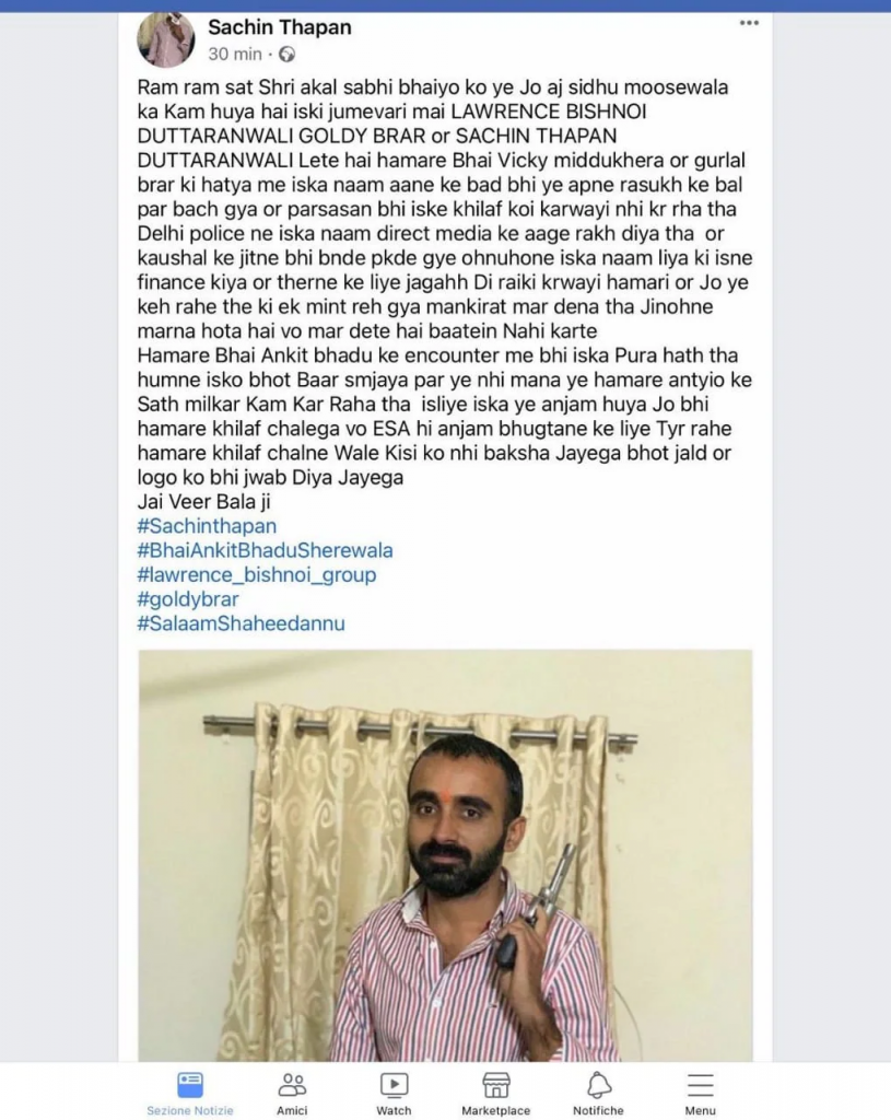 ਪੰਜਾਬ ਦੇ ਮਸ਼ਹੂਰ ਗਾਇਕ ਸਿੱਧੂ ਮੂਸੇਵਾਲਾ ਦਾ ਬੀਤੇ ਦਿਨ ਕਤਲ ਕਰਨ ਤੋਂ ਬਾਅਦ ਲਾਰੈਂਸ ਬਿਸ਼ਨੋਈ ਦੇ ਇੱਕ ਸਾਥੀ ਕੈਨੇਡਾ ਬੈਠੇ ਗੋਲਡੀ ਬਰਾੜ ਨੇ ਸਿੱਧੂ ਮੂਸੇਵਾਲਾ ਨੂੰ ਮਾਰਨ ਦੀ ਜ਼ਿੰਮੇਵਾਰੀ ਇੱਕ ਫੇਸਬੁੱਕ ਤੇ ਪੋਸਟ ਪਾ ਕੇ ਲਈ ਸੀ । ਉਸ ਤੋਂ ਬਾਅਦ ਇੱਕ ਹੋਰ ਲਾਰੈਂਸ ਬਿਸ਼ਨੋਈ ਦੇ ਸਾਥੀ ਗੈਂਗਸਟਰ ਸਚਿਨ ਥਾਪਨ ਨੇ ਆਪਣੀ ਫੇਸਬੁੱਕ ਤੇ ਪੋਸਟ ਪਾ ਕੇ ਕਤਲ ਦੀ ਜ਼ਿੰਮੇਵਾਰੀ ਲਈ ਹੈ। ਗੈਂਗਸਟਰ ਨੇ ਲਿਖਿਆ ਹੈ ਅਸੀਂ ਮਿੱਡੂਖੇੜਾ ਦੇ ਕਤਲ ਦਾ ਬਦਲਾ ਲਿਆ ਹੈ।