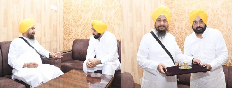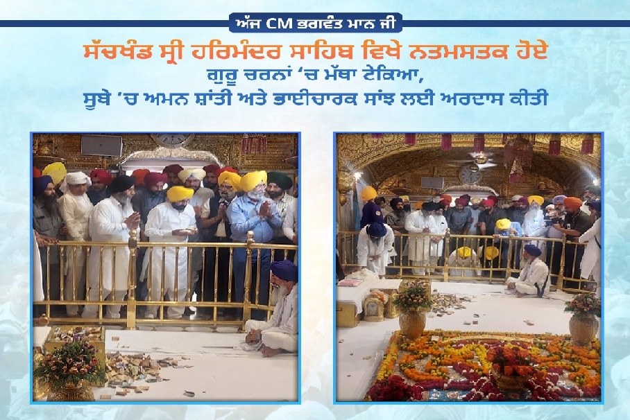 ਪੰਜਾਬ ਦੇ ਮੁੱਖ ਮੰਤਰੀ ਭਗਵੰਤ ਸਿੰਘ ਮਾਨ ਅੱਜ ਸ੍ਰੀ ਦਰਬਾਰ ਸਾਹਿਬ ਨਤਮਸਤਕ ਹੋਏ ਅਤੇ ਉਸ ਤੋਂ ਬਾਅਦ ਸ੍ਰੀ ਅਕਾਲ ਤਖ਼ਤ ਸਾਹਿਬ ਜੀ ਦੇ ਜਥੇਦਾਰ ਗਿਆਨੀ ਹਰਪ੍ਰੀਤ ਸਿੰਘ ਨਾਲ ਮੀਟਿੰਗ ਕੀਤੀ ਹੈ ।