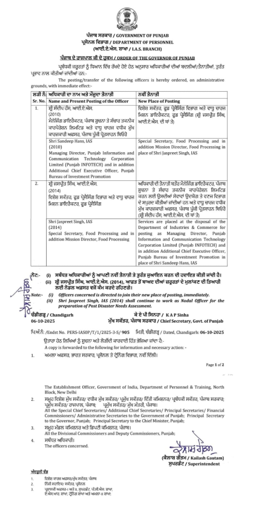 ਆਈ.ਏ.ਐੱਸ. ਜਸਪ੍ਰੀਤ ਸਿੰਘ ਦੀ ਤੈਨਾਤੀ ਬਤੌਰ ਮੈਨੇਜਿੰਗ ਡਾਇਰੈਕਟਰ, ਪੰਜਾਬ ਸੂਚਨਾ ਤੇ ਸੰਚਾਰ ਤਕਨੀਕ ਕਾਰਪੋਰੇਸ਼ਨ ਲਿਮਟਿਡ ਕਰਨ ਲਈ ਉਸਦੀਆਂ ਸੇਵਾਵਾਂ ਉਦਯੋਗ ਤੇ ਵਣਜ ਵਿਭਾਗ ਦੇ ਸਪੁਰਦ ਕੀਤੀਆਂ ਜਾਂਦੀਆਂ ਹਨ ਅਤੇ ਵਾਧੂ ਚਾਰਜ ਵਧੀਕ ਮੁੱਖ ਕਾਰਜਕਾਰੀ ਅਫਸਰ, ਪੰਜਾਬ ਪੂੰਜੀ ਪ੍ਰੋਤਸਾਹਨ ਬਿਓਰੋ ਲਗਯਾਇਆ ਗਿਆ ਹੈ। ਇਹ ਜ਼ਿੰਮੇਵਾਰੀ ਪਹਿਲਾਂ ਸੰਦੀਪ ਹੰਸ ਆਈ.ਏ.ਐਸ. ਕੋਲ ਸੀ।